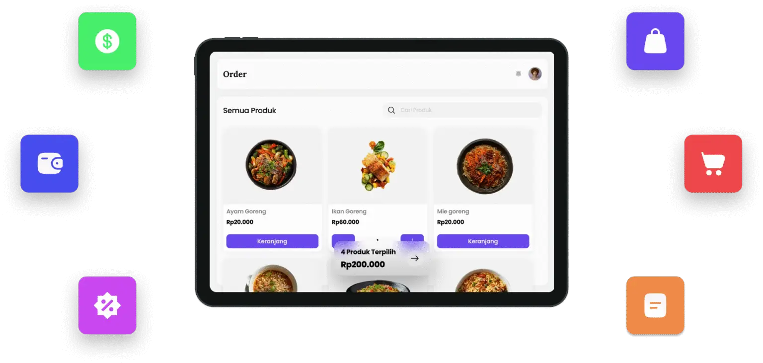 Atur pesanan makanan dan minuman, proses check-out cepat dengan dukungan untuk pelanggan member atau non-member.
